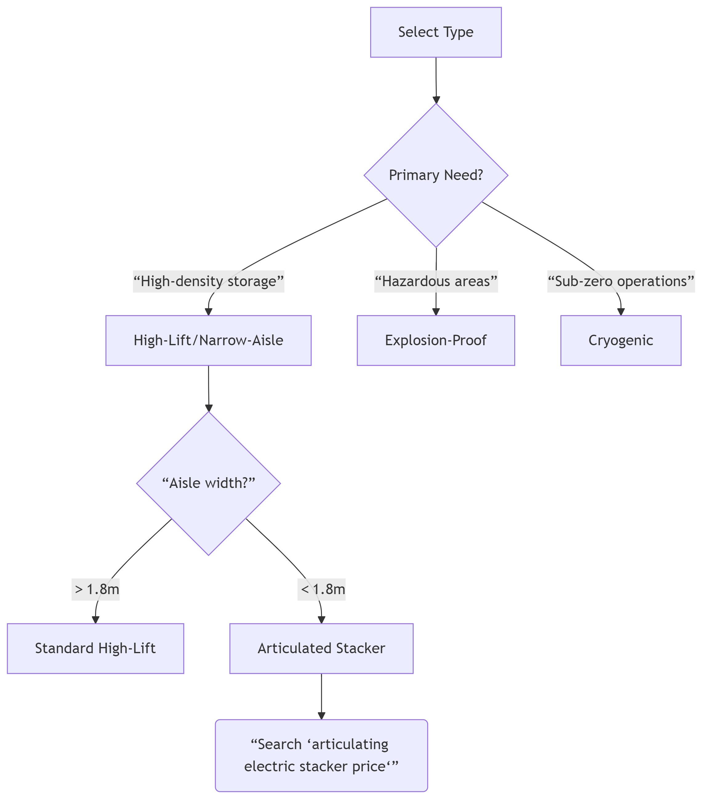Tip Aisle Width Target Keyword Tri-Directional 1.6-1.8m "tri-directional electric stacker"Articulated 1.4-1.6m "articulating narrow reach truck"3. Explosion-Proof Electric Pallet Jacks